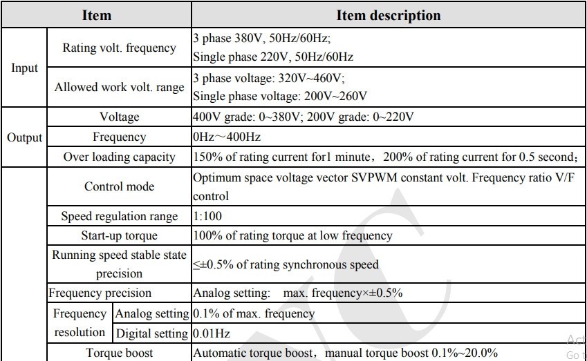 • Dãy công suất: 1 pha: 0.2kw ~ 2.2KW 220V;3 pha 0.75kw ~ 3.7KW 380V.